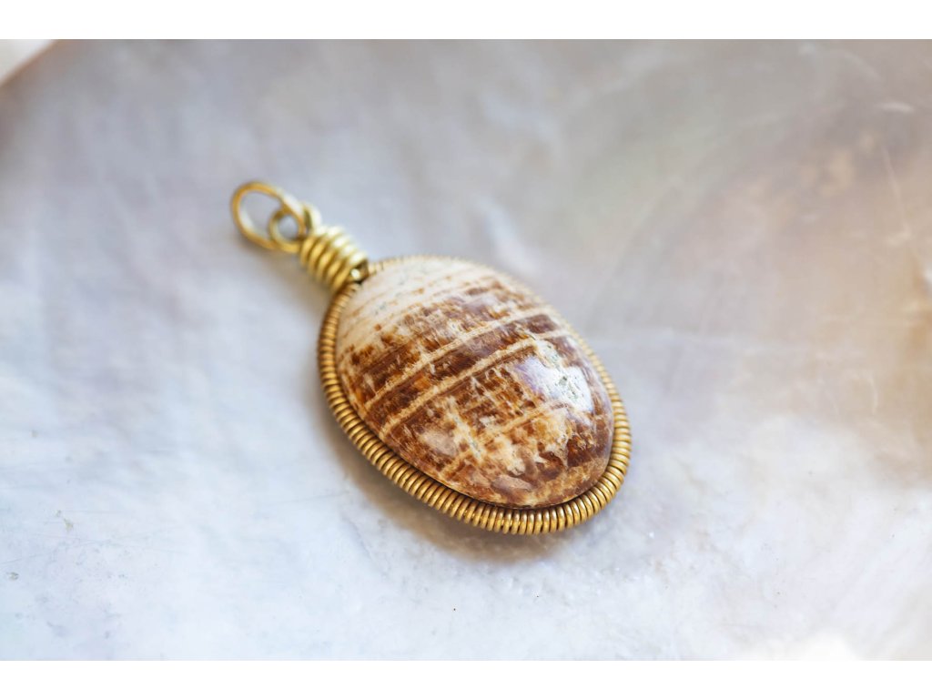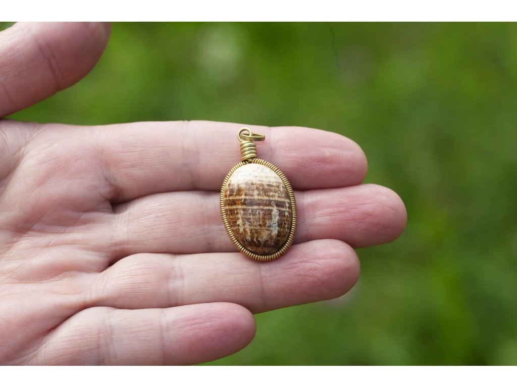 Přívěsek s aragonitem Přívěsek s krásně zbarveným žíhaným aragonitem v mosazné spirálce. Šperk byl navržen a ručně vytvořen v dílně našeho milého přítele a kolegy, kečuánského indiána Arona. Jeho tvorba vychází z tradičních peruánských technik výroby šperků. Aragonit dokáže uzemňovat tělesnou energii, posiluje spojení se Matkou zemí a stabilizuje kořenovou čakru. Podporuje trpělivost a vstřícnost, potlačuje přecitlivělost. Lidem, kteří na sebe mají příliš velké nároky, pomůže naučit se delegovat část svých povinností na jiné. Je velmi vhodný do různých amuletů na dennodenní nošení. Hmotnost cca 7 gDoplňkové parametry