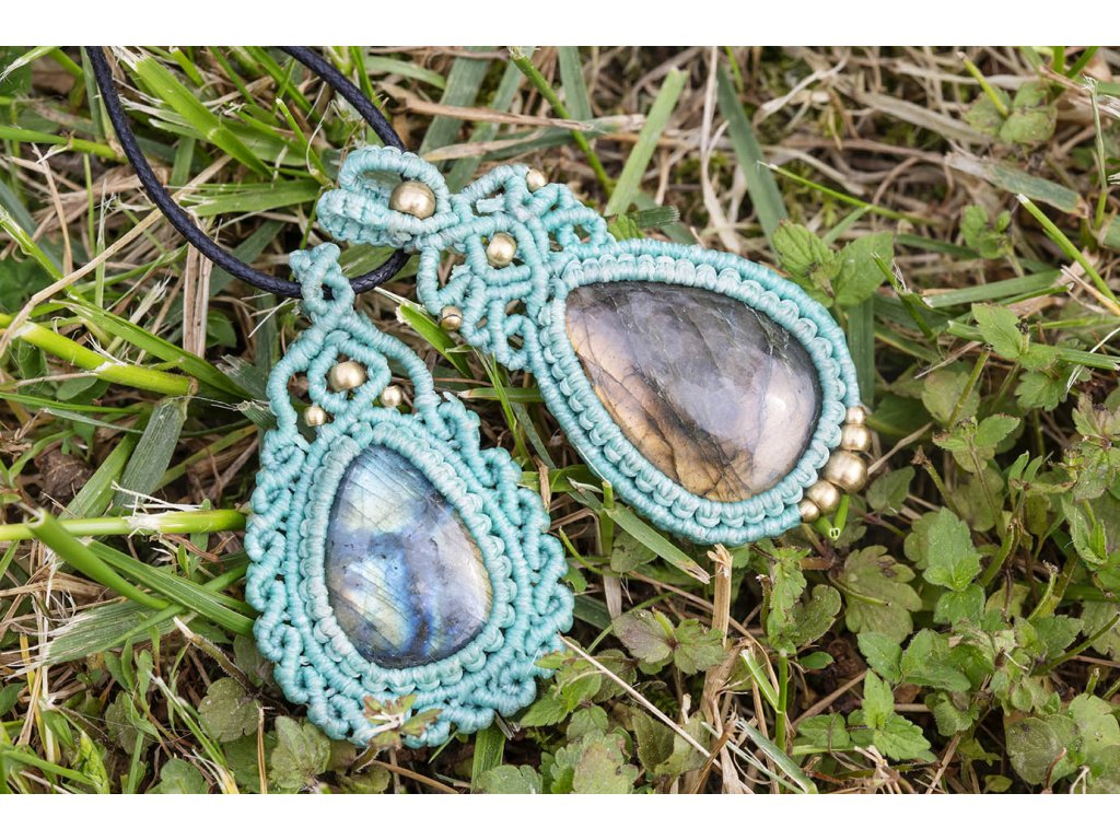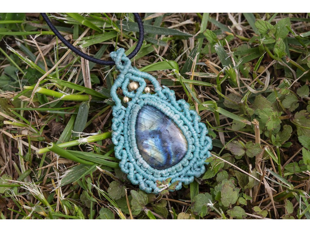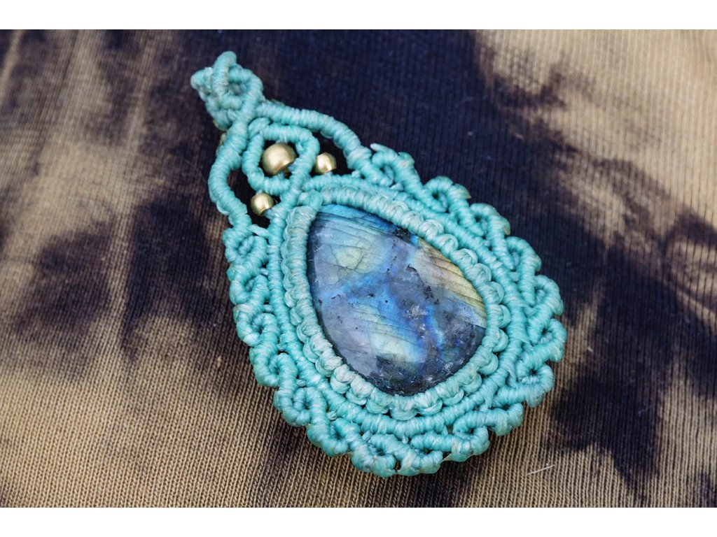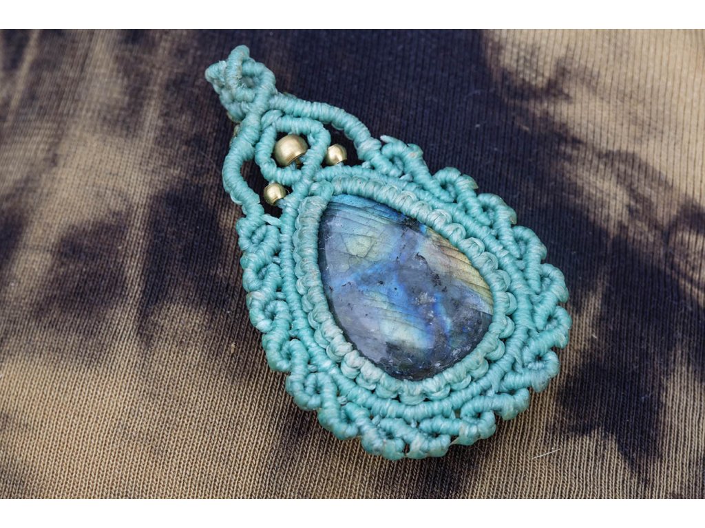 Přívěsek s labradoritem Macramé přívěsek s labradoritem. Labradorit je vhodný pro bytost, která je připravená ukázat světu své skryté hlubiny. Vynáší na povrch to, co před světem ukrýváme a osvobozuje naši osobnost od starých vzorců a zábran. Odložením zábran se navrací do života spontánnost a radost. Je to také ochranný kámen šamanů a mágů, aby nesešli z cesty při propojování různých dimenzí a světů, přináší světlo, které rozjasňuje tuto cestu. Rozměry kamene cca 2,5 x 3,5 cm Celková délka cca 6 cm Hmotnost cca 16 gDoplňkové parametry
