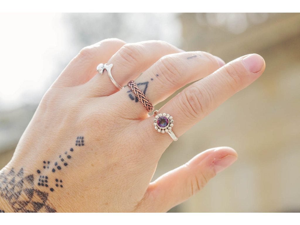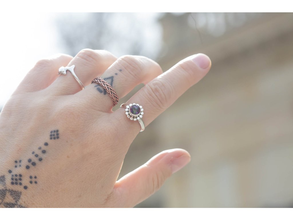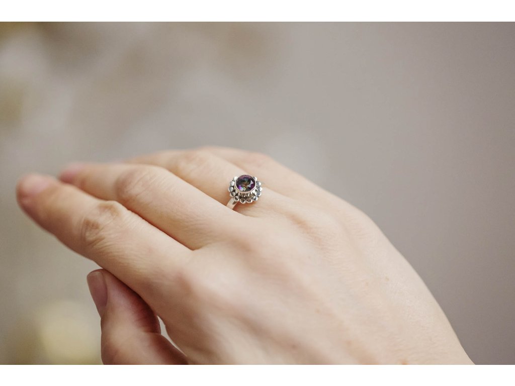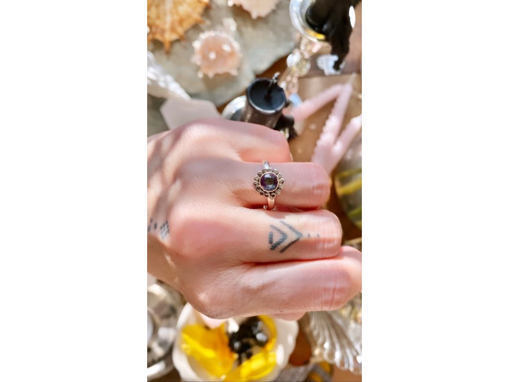 Prsten kytička s mystickým topazem Překrásný jemný prsten ve tvaru kytičky se stříbrnými lístky a vybroušeným mystickým topazem, který se třpytí fialovými a mechově zelenými odlesky. Topaz je ochranný kámen proti všem druhům negativity. Mírní strach, vztek a depresi. Zabraňuje náměsíčnosti a nočním můrám. Přináší radost a hojnost. Upevňuje zdraví, zaměřuje energii tam, kde je to třeba, uklidňuje, dobíjí a motivuje. Přináší pravdu a odpuštění, též přízeň osudu zajišťující úspěšné dosažení stanovených cílů. Zlepšuje komunikaci, meditaci, pomáhá s naladěním na vyšší já. Prsten nabízíme v těchto průměrech: 17 mm, 18 mm, 19 mm a 20 mm Průměr kamene cca: 0,5 cm Materiál kov: Stříbro Ag 925/1000Buďte první, kdo napíše příspěvek k této položce.