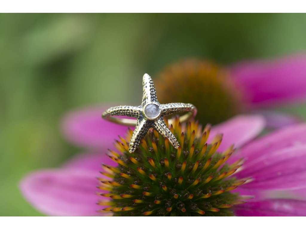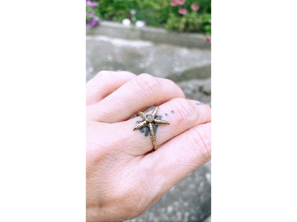 Prsten mořská hvězdice Krásný mosazný prsten mořská hvězdice s labradoritem. Labradorit je vhodný pro bytost, která je připravená ukázat světu své skryté hlubiny. Vynáší na povrch to, co před světem ukrýváme a osvobozuje naši osobnost od starých vzorců a zábran. Odložením zábran se navrací do života spontánnost a radost. Je to také ochranný kámen šamanů a mágů, aby nesešli z cesty při propojování různých dimenzí a světů, přináší světlo, které rozjasňuje tuto cestu. Průměr prstenu cca 18 mmDoplňkové parametry