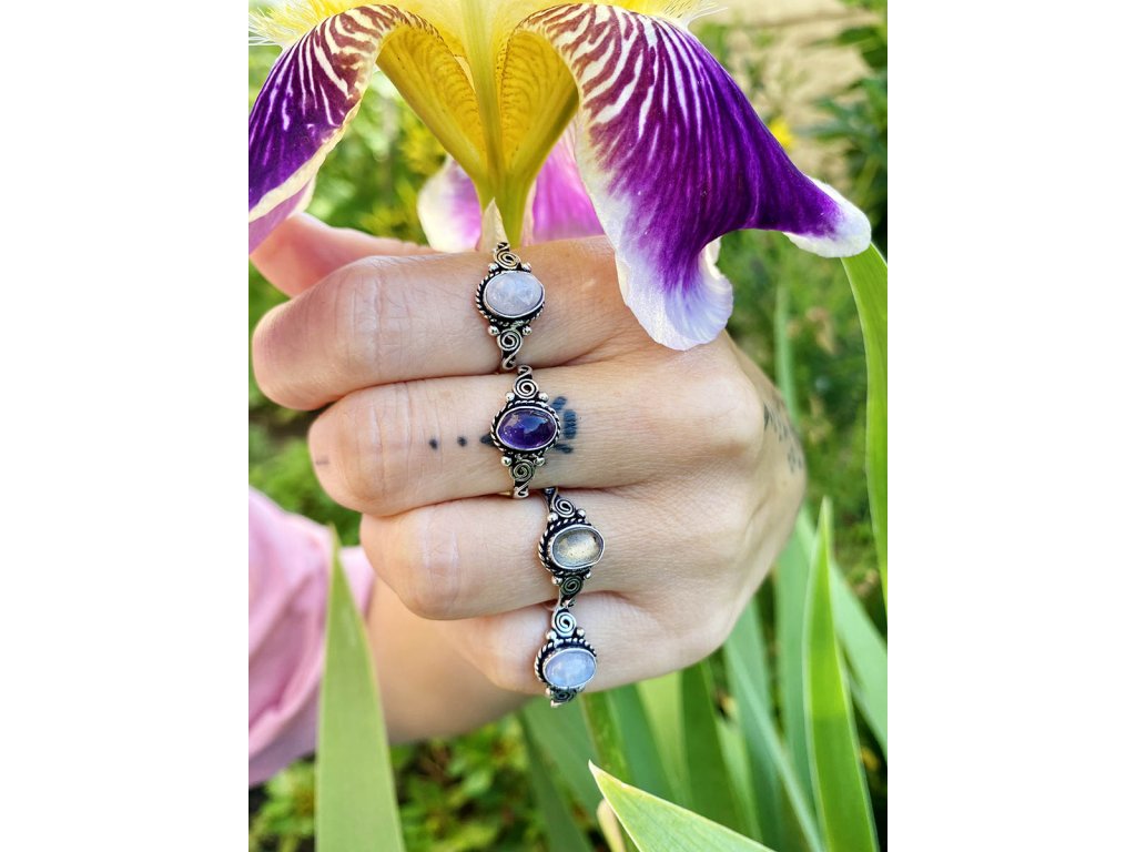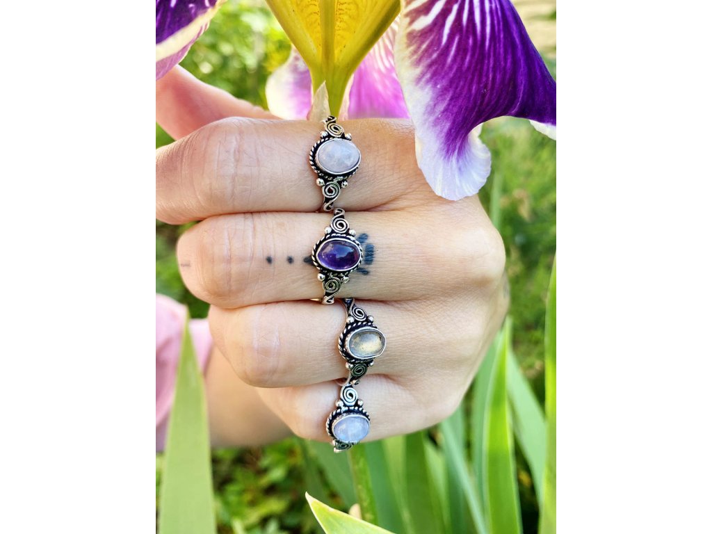 Prsten s drahokamem Jemný prstýnek z bílého kovu s oválným drahokamem. Na výběr je fialový ametyst, bílý měsíční kámen a opalizující průsvitný labradorit. Ametyst je kamenem čistoty ducha a meditace. Pomáhá nám v sobě objevovat sebeobětování, lásku, pokoru a nezištnost. Těmito vlastnostmi nám otevírá cestu do jiných dimenzí bytí. Je to kámen inspirace, směřuje naše myšlení k tvořivé práci a probouzí v nás intuici. Labradorit je vhodný pro bytost, která je připravená ukázat světu své skryté hlubiny. Vynáší na povrch to, co před světem ukrýváme a osvobozuje naši osobnost od starých vzorců a zábran. Odložením zábran se navrací do života spontánnost a radost. Je to také ochranný kámen šamanů a mágů, aby nesešli z cesty při propojování různých dimenzí a světů, přináší světlo, které rozjasňuje tuto cestu. Měsíční kámen je uchvacující drahokam, který má silné magické účinky. Ochraňuje citlivé povahy a napomáhá vyrovnaným šťastným vztahům. Je považován za drahokam štěstí. Působí pozitivně na intuici, tvořivost a podpoří Vás v nových začátcích. Šperk s měsíčním kamenem by neměl chybět ve šperkovnici žádné ženy. Více o měsíčním kameni se dočtete na našem blogu.Buďte první, kdo napíše příspěvek k této položce.