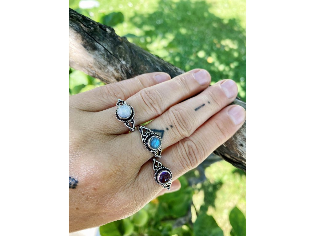 Prsten s drahokamem Jemný překrásný prsten z bílého kovu s drahokamem. Na výběr je bílý měsíční kámen, fialový ametyst a šedomodrozelený labradorit. Ametyst je kamenem čistoty ducha a meditace. Pomáhá nám v sobě objevovat sebeobětování, lásku, pokoru a nezištnost. Těmito vlastnostmi nám otevírá cestu do jiných dimenzí bytí. Je to kámen inspirace, směřuje naše myšlení k tvořivé práci a probouzí v nás intuici. Labradorit je vhodný pro bytost, která je připravená ukázat světu své skryté hlubiny. Vynáší na povrch to, co před světem ukrýváme a osvobozuje naši osobnost od starých vzorců a zábran. Odložením zábran se navrací do života spontánnost a radost. Je to také ochranný kámen šamanů a mágů, aby nesešli z cesty při propojování různých dimenzí a světů, přináší světlo, které rozjasňuje tuto cestu. Měsíční kámen je uchvacující drahokam, který má silné magické účinky. Ochraňuje citlivé povahy a napomáhá vyrovnaným šťastným vztahům. Je považován za drahokam štěstí. Působí pozitivně na intuici, tvořivost a podpoří Vás v nových začátcích. Šperk s měsíčním kamenem by neměl chybět ve šperkovnici žádné ženy. Více o měsíčním kameni se dočtete na našem blogu.Buďte první, kdo napíše příspěvek k této položce.