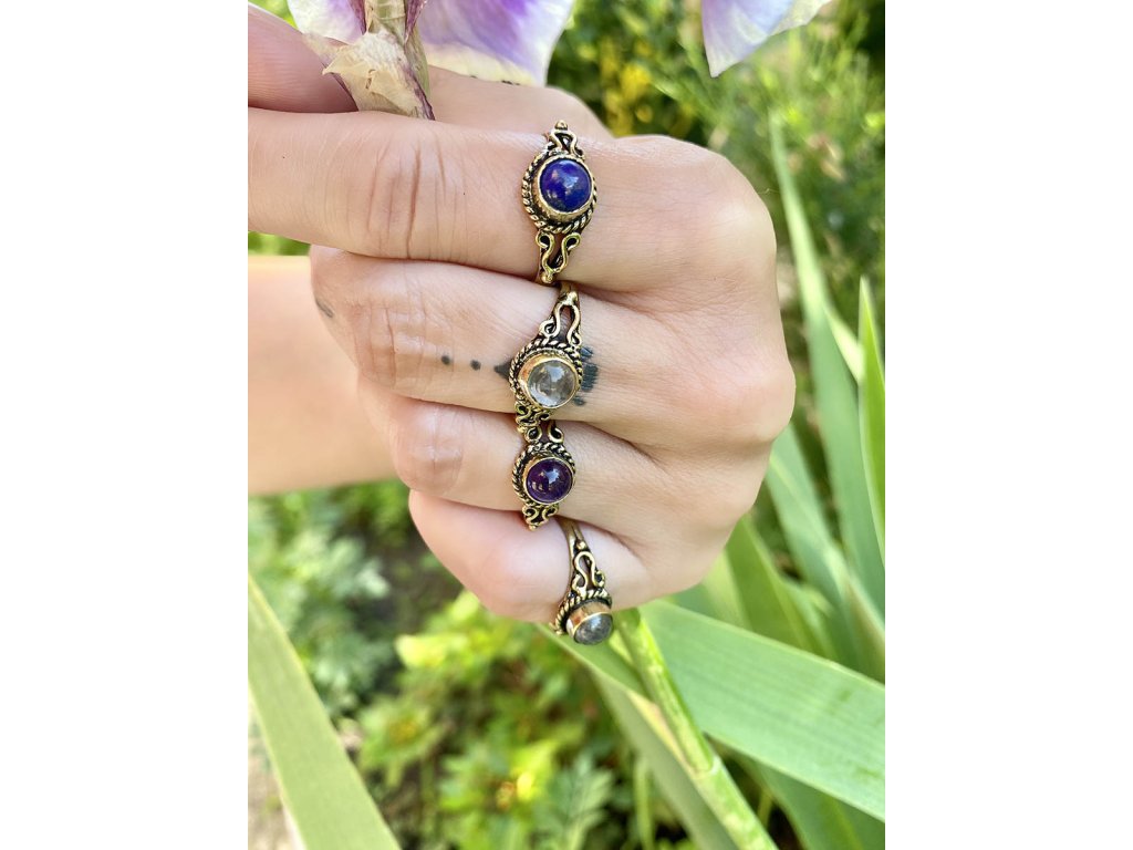Prsten s drahokamem Jemný mosazný prsten s kulatým drahokamem. Na výběr je fialový ametyst, modrý lapis lazuli, bílý měsíční kámen a šedozlatý labradorit. Ametyst je kamenem čistoty ducha a meditace. Pomáhá nám v sobě objevovat sebeobětování, lásku, pokoru a nezištnost. Těmito vlastnostmi nám otevírá cestu do jiných dimenzí bytí. Je to kámen inspirace, směřuje naše myšlení k tvořivé práci a probouzí v nás intuici. Labradorit je vhodný pro bytost, která je připravená ukázat světu své skryté hlubiny. Vynáší na povrch to, co před světem ukrýváme a osvobozuje naši osobnost od starých vzorců a zábran. Odložením zábran se navrací do života spontánnost a radost. Je to také ochranný kámen šamanů a mágů, aby nesešli z cesty při propojování různých dimenzí a světů, přináší světlo, které rozjasňuje tuto cestu. Lapis lazuli je jedinečný drahokam, který pomáhá a podporuje svého nositele v mnoha ohledech. Navozuje vnitřní klid a mír, podporuje radost, odvahu, lásku, poctivost a kreativitu. Upevňuje mezilidské vztahy a zlepšuje komunikaci. Zvyšuje sebevědomí a podporuje osobní růst. Mírní strach, vztek a agresivitu. Má blahodárný vliv na paměť a úsudek. Dokáže odstraňovat stres a taky být velkým pomocníkem při detoxikaci organismu, například při dietě. Měsíční kámen je uchvacující drahokam, který má silné magické účinky. Ochraňuje citlivé povahy a napomáhá vyrovnaným šťastným vztahům. Je považován za drahokam štěstí. Působí pozitivně na intuici, tvořivost a podpoří Vás v nových začátcích. Šperk s měsíčním kamenem by neměl chybět ve šperkovnici žádné ženy. Více o měsíčním kameni se dočtete na našem blogu.Buďte první, kdo napíše příspěvek k této položce.