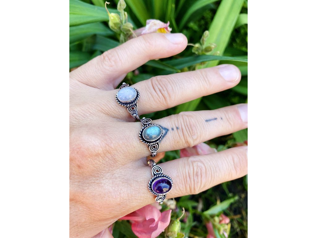 Prsten s drahokamem a spirálou Překrásný jemný prsten z bílého kovu s drahokamem a spirálou. Na výběr je fialový ametyst, bílý měsíční kámen a zelenošedavý labradorit. Ametyst je kamenem čistoty ducha a meditace. Pomáhá nám v sobě objevovat sebeobětování, lásku, pokoru a nezištnost. Těmito vlastnostmi nám otevírá cestu do jiných dimenzí bytí. Je to kámen inspirace, směřuje naše myšlení k tvořivé práci a probouzí v nás intuici. Více o ametystu se dočtete na našem blogu. Měsíční kámen je uchvacující drahokam, který má silné magické účinky. Ochraňuje citlivé povahy a napomáhá vyrovnaným šťastným vztahům. Je považován za drahokam štěstí. Působí pozitivně na intuici, tvořivost a podpoří Vás v nových začátcích. Šperk s měsíčním kamenem by neměl chybět ve šperkovnici žádné ženy. Více o měsíčním kameni se dočtete na našem blogu. Labradorit je vhodný pro bytost, která je připravená ukázat světu své skryté hlubiny. Vynáší na povrch to, co před světem ukrýváme a osvobozuje naši osobnost od starých vzorců a zábran. Odložením zábran se navrací do života spontánnost a radost. Je to také ochranný kámen šamanů a mágů, aby nesešli z cesty při propojování různých dimenzí a světů, přináší světlo, které rozjasňuje tuto cestu.Buďte první, kdo napíše příspěvek k této položce.