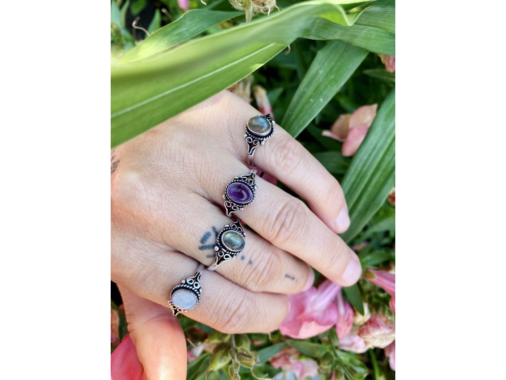 Prsten s oválným drahokamem Překrásný prsten z bílého kovu s oválným drahokamem. Na výběr je fialový ametyst, bílý měsíční kámen, šedozelený labradorit. Ametyst je kamenem čistoty ducha a meditace. Pomáhá nám v sobě objevovat sebeobětování, lásku, pokoru a nezištnost. Těmito vlastnostmi nám otevírá cestu do jiných dimenzí bytí. Je to kámen inspirace, směřuje naše myšlení k tvořivé práci a probouzí v nás intuici.Více o ametystu se dočtete na našem blogu. Labradorit je vhodný pro bytost, která je připravená ukázat světu své skryté hlubiny. Vynáší na povrch to, co před světem ukrýváme a osvobozuje naši osobnost od starých vzorců a zábran. Odložením zábran se navrací do života spontánnost a radost. Je to také ochranný kámen šamanů a mágů, aby nesešli z cesty při propojování různých dimenzí a světů, přináší světlo, které rozjasňuje tuto cestu. Měsíční kámen je uchvacující drahokam, který má silné magické účinky. Ochraňuje citlivé povahy a napomáhá vyrovnaným šťastným vztahům. Je považován za drahokam štěstí. Působí pozitivně na intuici, tvořivost a podpoří Vás v nových začátcích. Šperk s měsíčním kamenem by neměl chybět ve šperkovnici žádné ženy. Více o měsíčním kameni se dočtete na našem blogu.Buďte první, kdo napíše příspěvek k této položce.