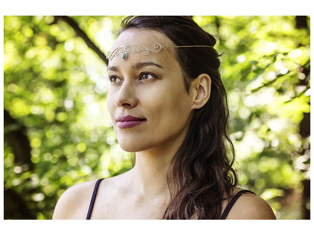 Tiára s tyrkysem Překrásná mosazná zdobená tiára s macramé šňůrkou a tyrkysem. S ní stanete královnou všech magických rituálů. Další překrásné magické tiáry najdete zde. Tyrkys slouží jeho nositeli k tříbení a vyjadřování vlastních myšlenek, zesiluje intuici, vyrovnanost, podporuje úspěch. Také chrání auru a pohlcuje škodlivé vlivy a zahání zlé sny. Posiluje pozitivní energii. Ve vztahové rovině přináší štěstí a klid. Obvod je nastavitelný.Doplňkové parametry
